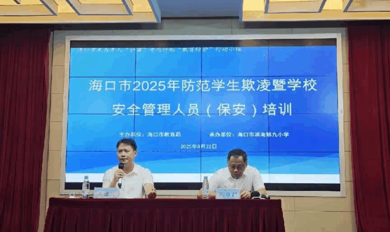 为全面贯彻落实省、市教育工作会议精神,切实提升校园安全管理水平,2025年8月22日,“2025年海口市防范学生欺凌暨学校安全管理人员专题培训”在海口市滨海第九小学正式启动。本次培训汇聚了全市各区教育局、市直属学校(幼儿园)分管领导、具体工作负责人以及各校保安骨干力量,共计280余名学员参加。