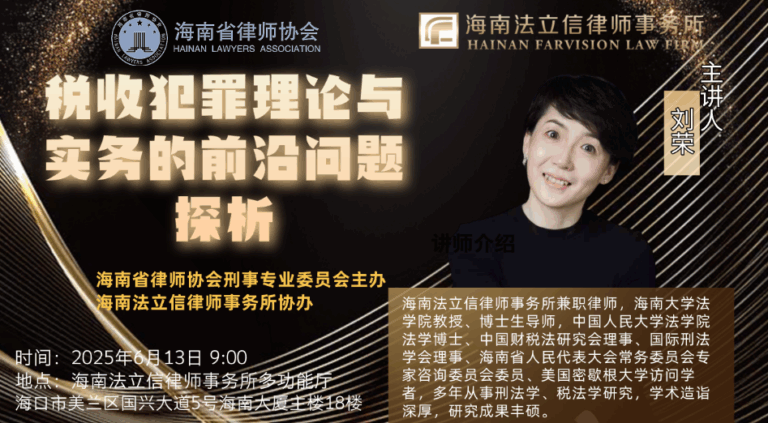 2025年6月13日上午,由海南省律师协会刑事专业委员会主办,海南法立信律师事务所承办的税收犯罪理论与实务的前沿问题探析专题讲座在法立信多功能厅顺利举办。旨在贯彻落实海南自由贸易港关于法律服务业高质量发展的相关部署,助力律师提升税收犯罪领域的专业能力…